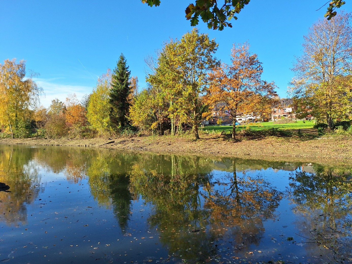 Het grootste deel van het slib is afgevoerd en de eerste ecologische oevers zijn aangelegd. De werken aan deze vijver nemen veel tijd in beslag door de grote hoeveelheid slib en onstabiele bodem.